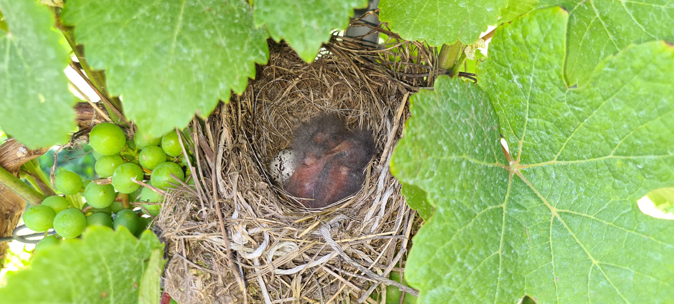 Bei unserer letzten Arbeit dem Traubenhalbieren haben wir eine wunderschöne Entdeckung gemacht: Kleine Junge Vögel neben jungen kleinen Trauben - für uns immer wieder ein Zeichen, dass auch wir tolle Biodiversität in den Reben zu pflegen.